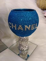 Globe shaped, with custom stand, and glass base. Logo designed with hand-placed rhinestones. Available in Turquoise, Royal blue, Black, Silver, 24k Gold, Champagne Gold, & Red!
